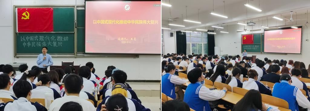 课堂上,王亮老师将主题分为“中国式现代化是实现中华民族伟大复兴的光明大道”、“中国式现代化的中国特色”、“中国式现代化的本质要求”、“推进中国式现代化的重大原则”四个部分,深入浅出地向同学们讲述了中国式现代化在实现和推动中华民族伟大复兴中所发挥的重要作用。中国式现代化,开创了不同于西方资本主义现代化的全新路径,为人类对更好社会制度的探索提供了中国方案、贡献了中国智慧。