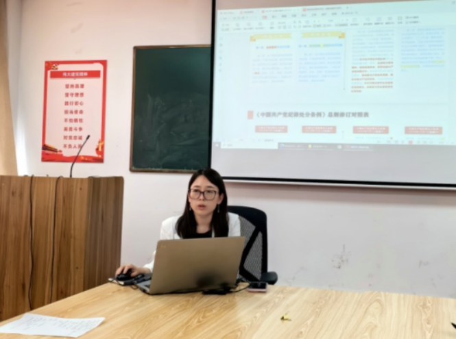课堂上,潘娜以新修订的《中国共产党纪律处分条例》为主要内容,从《条例》修订的重要意义、对比《条例》修订前后条文变化以及《条例》的重点条文解读等方面进行了详细解读。就全体党员如何进行党纪学习,她提出了三点要求,一是牢记党员身份,严守规矩纪律;二是勇于自我革命,永葆战斗力;三是砥砺奋进,勇担时代使命。结合公司工作实际,她希望广大研究生党员要领悟党纪的严肃性和重要性,持续深学细悟《条例》,把握“六大纪律”的主旨要义和规定要求,强化纪律意识,加强自我约束。要把遵守党的纪律贯穿研究生学习生活的方方面面,遵守学术规范和道德准则,坚定学术信仰和追求,不断攀登科研高峰。要肩负时代重任,践行社会责任,把科研成果应用在建设社会主义现代化强国的伟大事业中,学纪知纪明纪守纪,为建功新时代保驾护航。