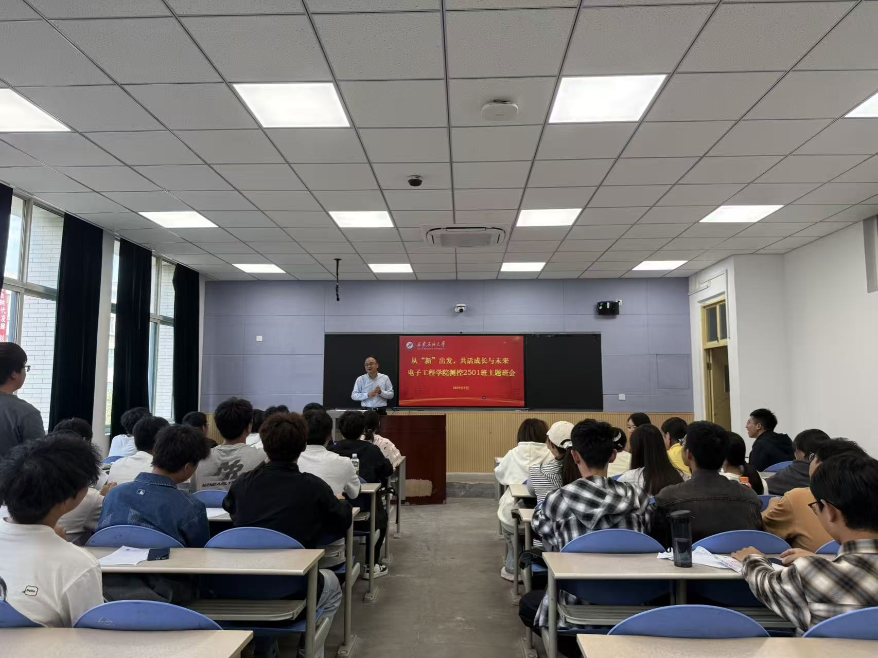 在专题授课环节,赵健围绕“融入新集体”与“规划大学四年”两大核心内容展开。他谈到,大学是人生成长的重要阶段,融入新集体是开启老员工活的第一步。从宿舍关系维系、班级活动参与到社团活动协作,每一次互动都是提升沟通能力、培养团队精神的机会,而良好的集体氛围更是个人成长的“助推器”。随后,他从“人生规划”“学业深耕”“能力提升”“品格塑造”四个维度,为新生如何有意义地度过四年大学时光提供方向指引。勉励同学们始终牢记“好学力行、自强不息”的校训,将个人成长与能源事业发展紧密结合,筑牢专业基础,扎实学好专业知识,积极参与科研实践,传承“石油精神”“铁人精神”,在集体中锤炼意志、增长才干,努力成长为兼具专业素养与责任担当的新时代能源人才,为国家能源事业发展贡献西石大力量。