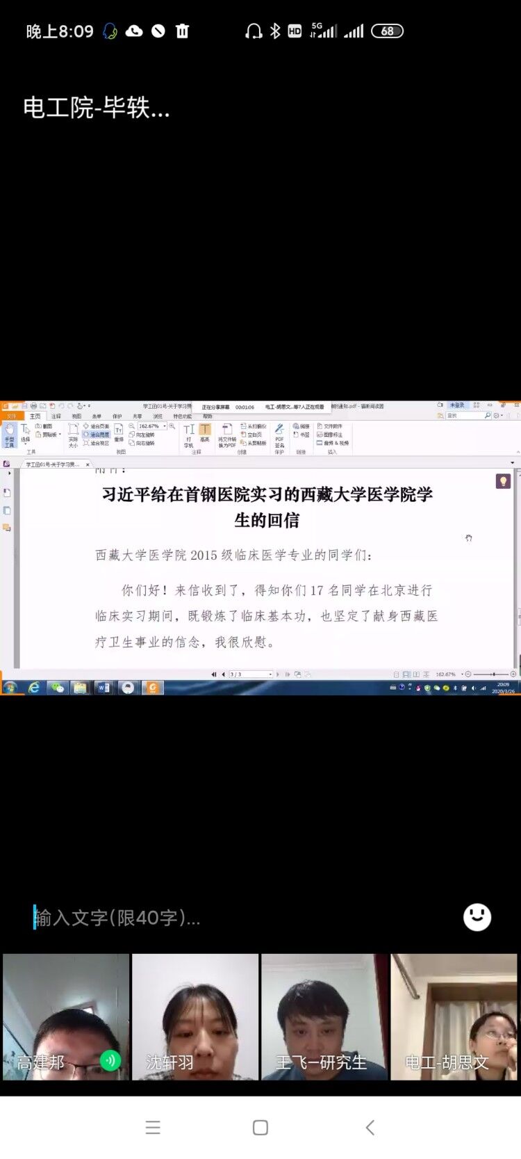 毕轶慧副书记首先带领全体员工工作干部学习了《习近平给首钢医院实习的西藏大学医公司员工的回信》原文,向广大学工干部解读了总书记回信的深刻内涵,要求全体学工干部将学习回信精神与贯彻落实习近平总书记坚决打赢疫情防控阻击战的重要指示密切结合起来,与深入学习习近平总书记关于教育的重要论述结合起来,把学习贯彻习近平总书记重要回信精神作为创新思想政治教育工作的重要指引,注重通过网络互动研讨、主题班会、个人心得分享等方式开展师生学习教育活动,有针对性地做好疫情防控期间教育管理工作。随后,公司专职组织员、全体员工工作干部分别汇报了自己学习《习近平给首钢医院实习的西藏大学医公司员工的回信》的心得和收获,大家一直认为将以习近平总书记回信精神为指导,戮力同心、坚定信念,不断做好员工教育管理服务各项工作,努力培养员工生成长成才。