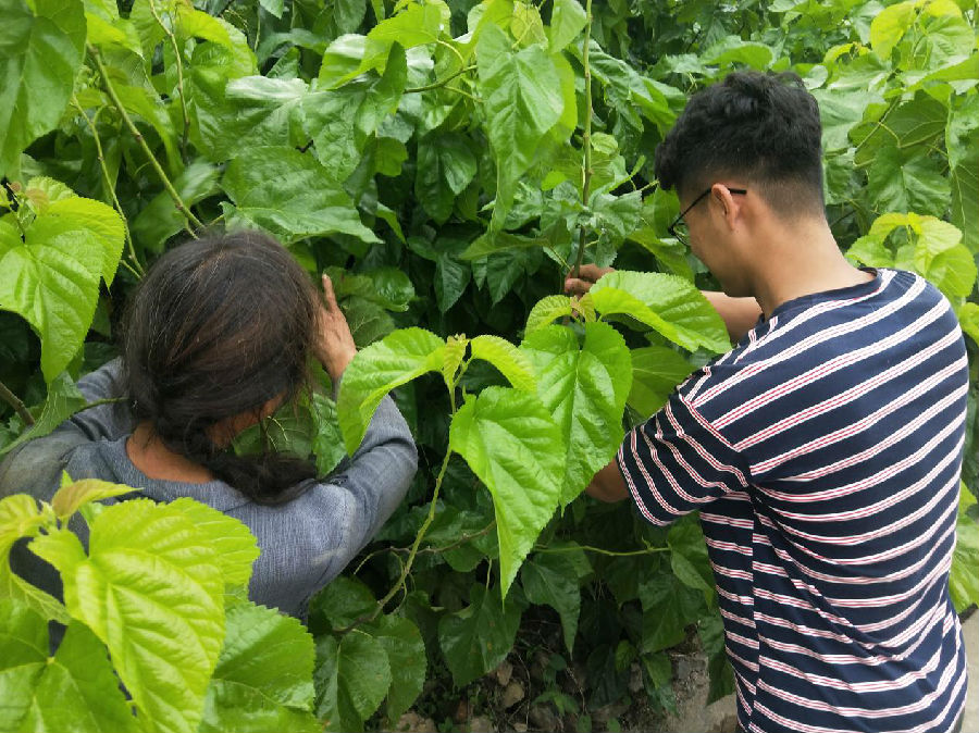 蚕桑养殖是迎丰镇的特色产业,为了切实发展地方经济,拓展群众脱贫致富路径当地成立的蚕桑专业合作社,不仅为社员提供各类服务指导,还为建档立卡贫困户提供了产业脱贫规划,加速贫困户产业脱贫进程。队员们深入农田了解当地生产情况,调研了蚕桑养殖情况,体验桑叶采摘。