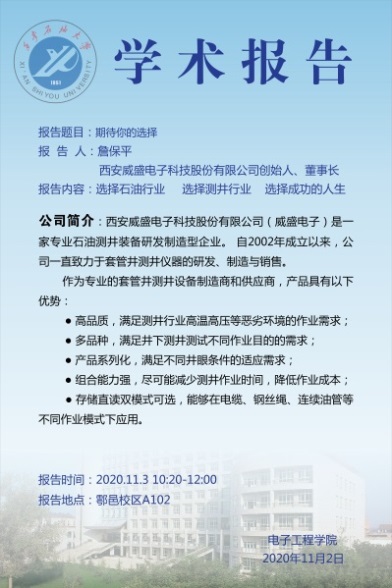 近期,为了帮助员工更好的了解专业,明确学习目标,激发学习兴趣,mjm世界杯官网周静教授在测控技术与仪器专业的《新生研讨课》中,积极进行教学改革,邀请了西安威盛电子科技股份有限公司创始人詹保平、北京六合伟业科技股份有限公司创始人冯建宇、西安格威石油仪器有限公司董事长张曦三位企业家走进课堂,给大一新生带来了三场精彩的报告。报告从石油行业的发展、国内外形势、前言技术出发,结合自身创业历程,讲述了在目前的形势下,企业面临的机遇与挑战,引导员工建立创新创业的意识。