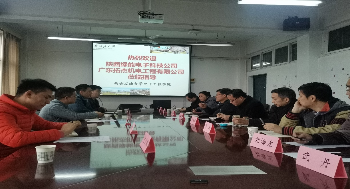 12月7日上午,广东拓杰机电工程有限公司总经理潘志杰、陕西绿能电子科技有限公司总经理助理赵青、副总经理李贵虎等领导一行来公司开展技术交流与合作洽谈,长庆工程设计有限公司电仪信工程设计部副主任李化龙高级工程师陪同来访,交流会在1号教学楼905会议室举行。公司党委书记何铖、副书记毕轶慧、副经理高国旺及自动化教、电气工程及其自动化、安全工程等相关专业的教师参加了交流座谈,公司副经理高国旺主持交流会。