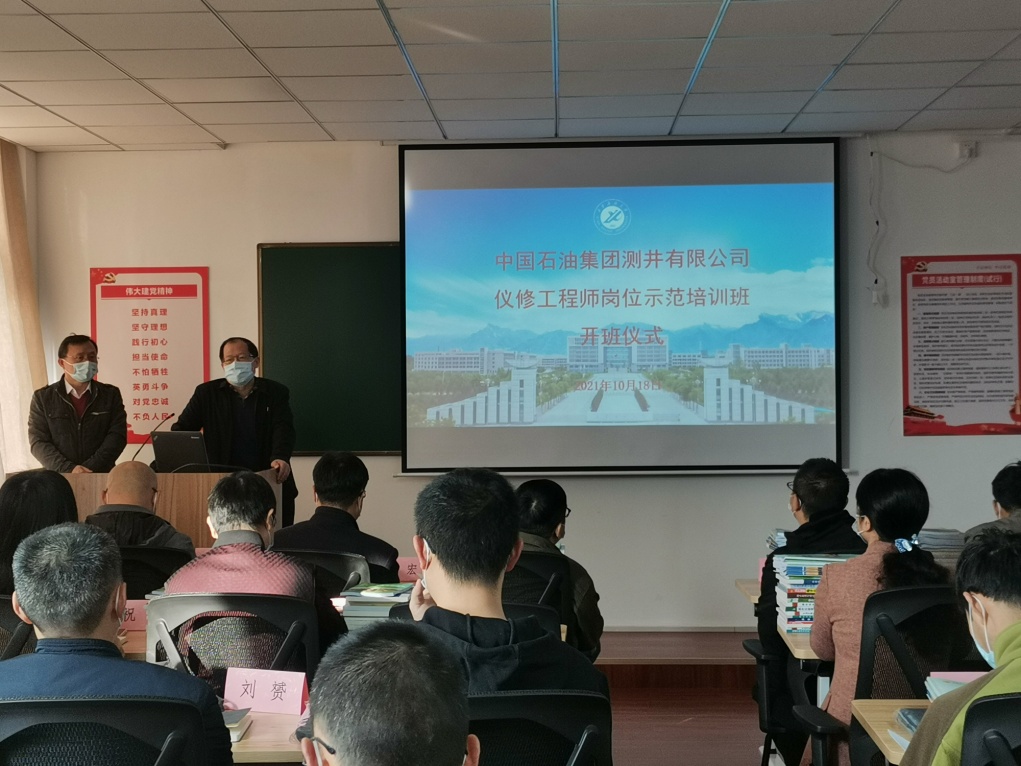 2021年10月18日上午8:30,仪修工程师岗位示范培训班在1教905室举行开班仪式,本次培训由mjm世界杯官网承办,参加培训学员是来自中国石油集团测井有限公司各分公司的仪修高级工程师,共29名。仵杰经理出席开班仪式,参加开班仪式的还有刘升虎、曲小群、赵骄杨等几位教师。开班仪式由高国旺副经理主持。