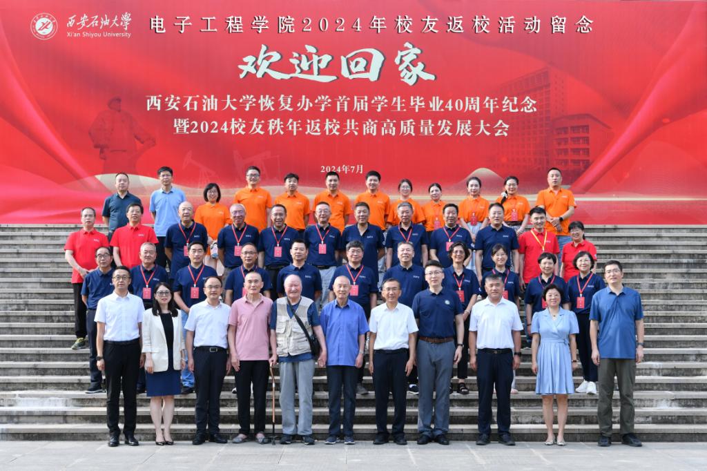 公司领导班子、教师代表及秩年返校员工在雁塔校区忠实广场合影留念。