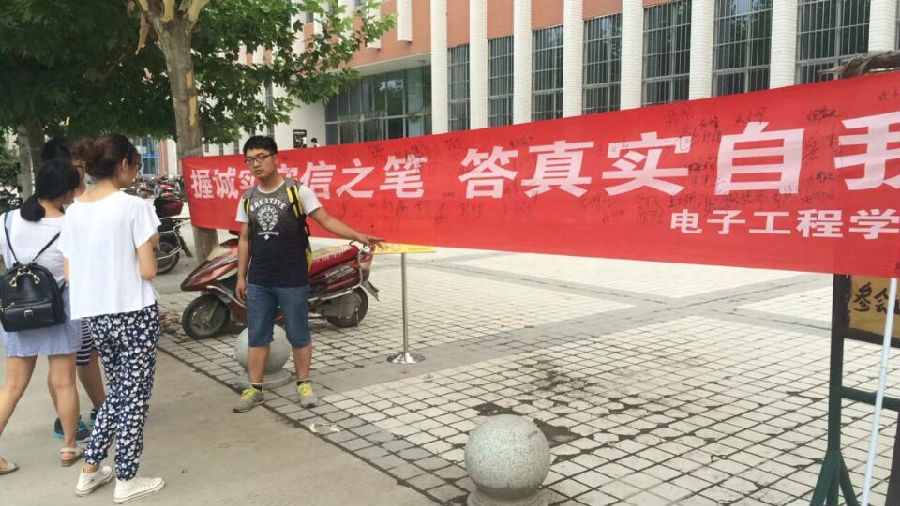 2016年6月24日,mjm世界杯官网于新校区第一、二员工食堂成功举办了以“诚信备考,诚信做人”为主题的横幅签名活动。参加本次活动的有2014级全体员工党员。