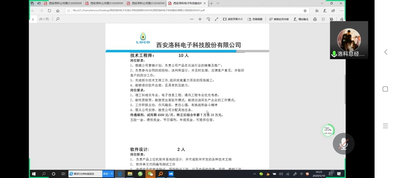 西安洛科电子科技股份有限公司总经理兰孟平结合PPT,向参会毕业生宣讲介绍了洛科公司的发展史、经营理念、企业文化、业务范围、招聘需求等情况,重点介绍了不同岗位的工作性质、福利待遇、工作地点等情况。此次洛科公司举办线上专场招聘会共需招聘技术工程师、开发助等岗位人员20人。随后,参会毕业生就自己关注的具体问题与兰孟平总经理进行了线上交流咨询,兰孟平总经理表示诚挚邀请广大毕业生到公司实习、考察,期待同学们加入快速发展的洛科电子大家庭。